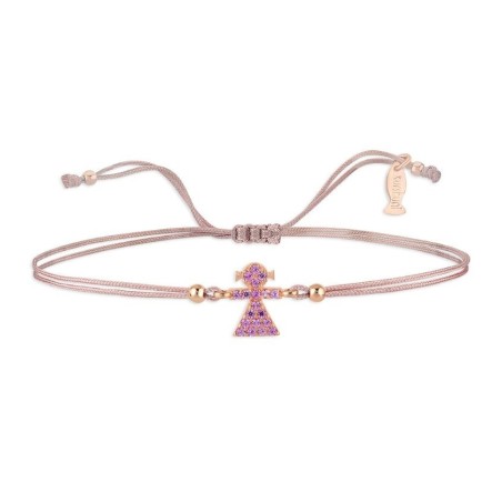 Il gioiello è in argento 925‰ rosè, realizzato con filo rosa e dettaglio centrale a forma di Bimba impreziosito da luminose pietre zirconi rosa. Chiusura a coulisse.