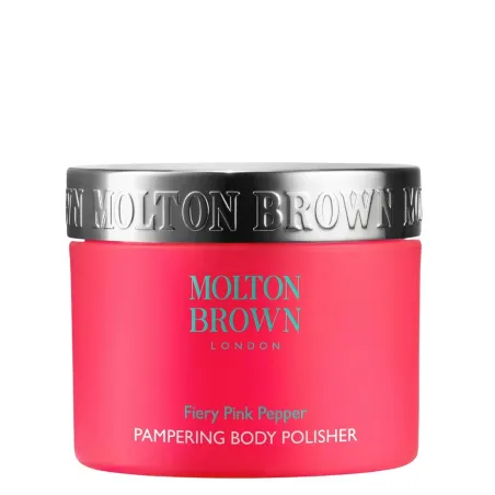 Fiery Pink Pepper Pampering Body Polisher di Molton Brown, è uno scrub per il corpo con aromi speziati e dolci, con bambù esfoliante che lucida la pelle, perfezionando e levigando la sua consistenza per una sensazione sontuosamente morbida e un bagliore elegante.